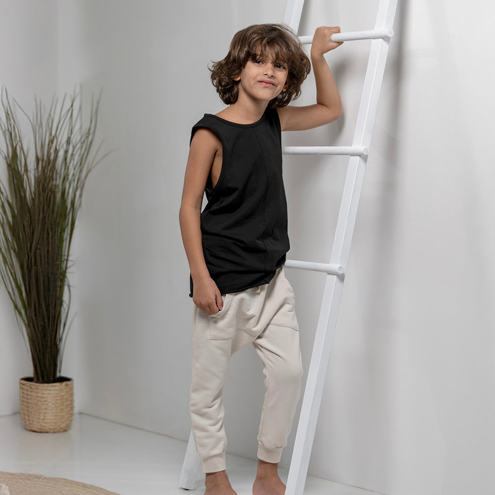 Add a cool and contemporary piece to your child's wardrobe with our long Baggy Sleeveless cotton T-Shirt! Designed for comfort and style, this boys t-shirt features a loose, baggy fit that allows for unrestricted movement. The 100% cotton and sleeveless design make it perfect for warm weather, while the extended length adds a modern touch. Ideal to wear it with a sweatpant or a short.