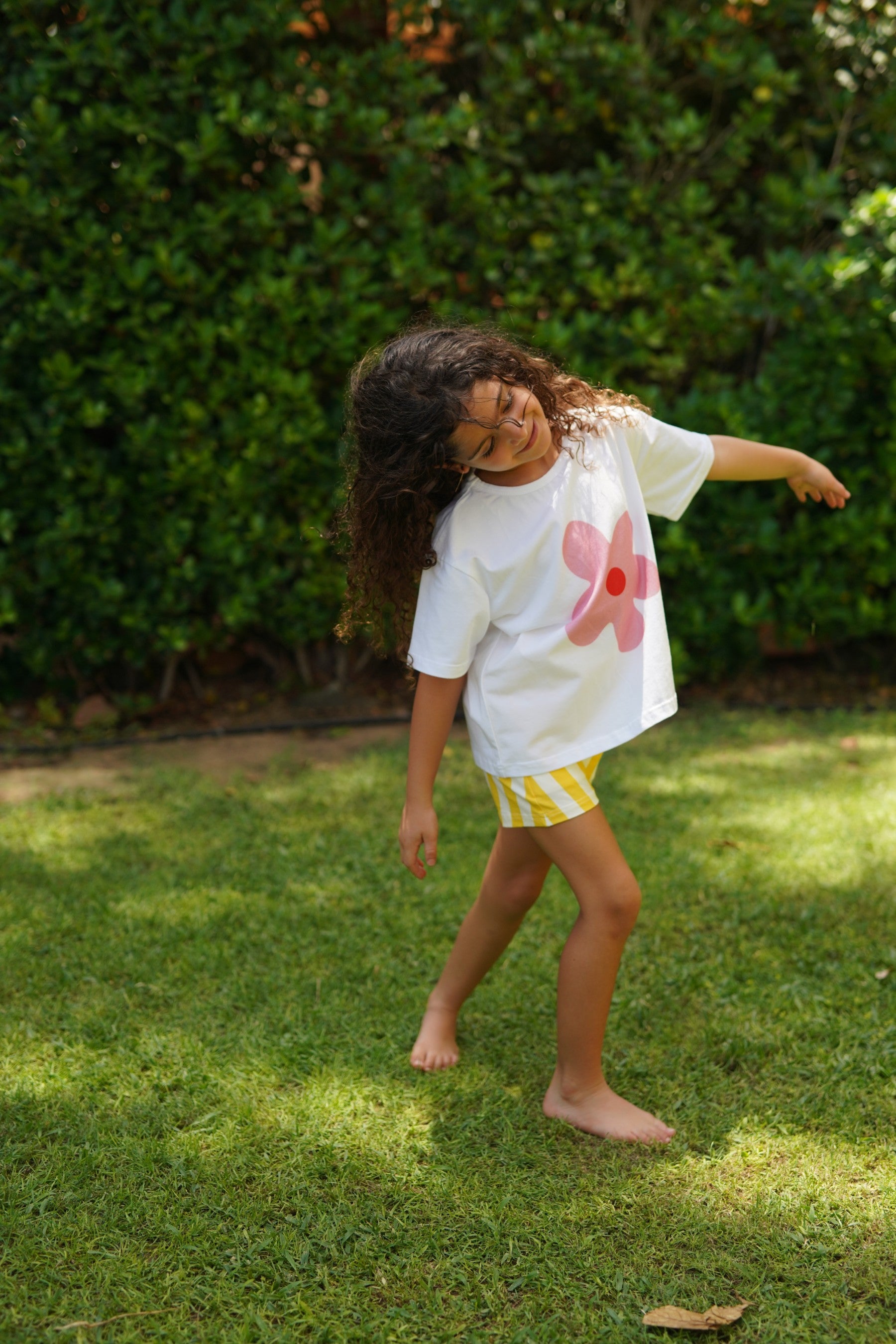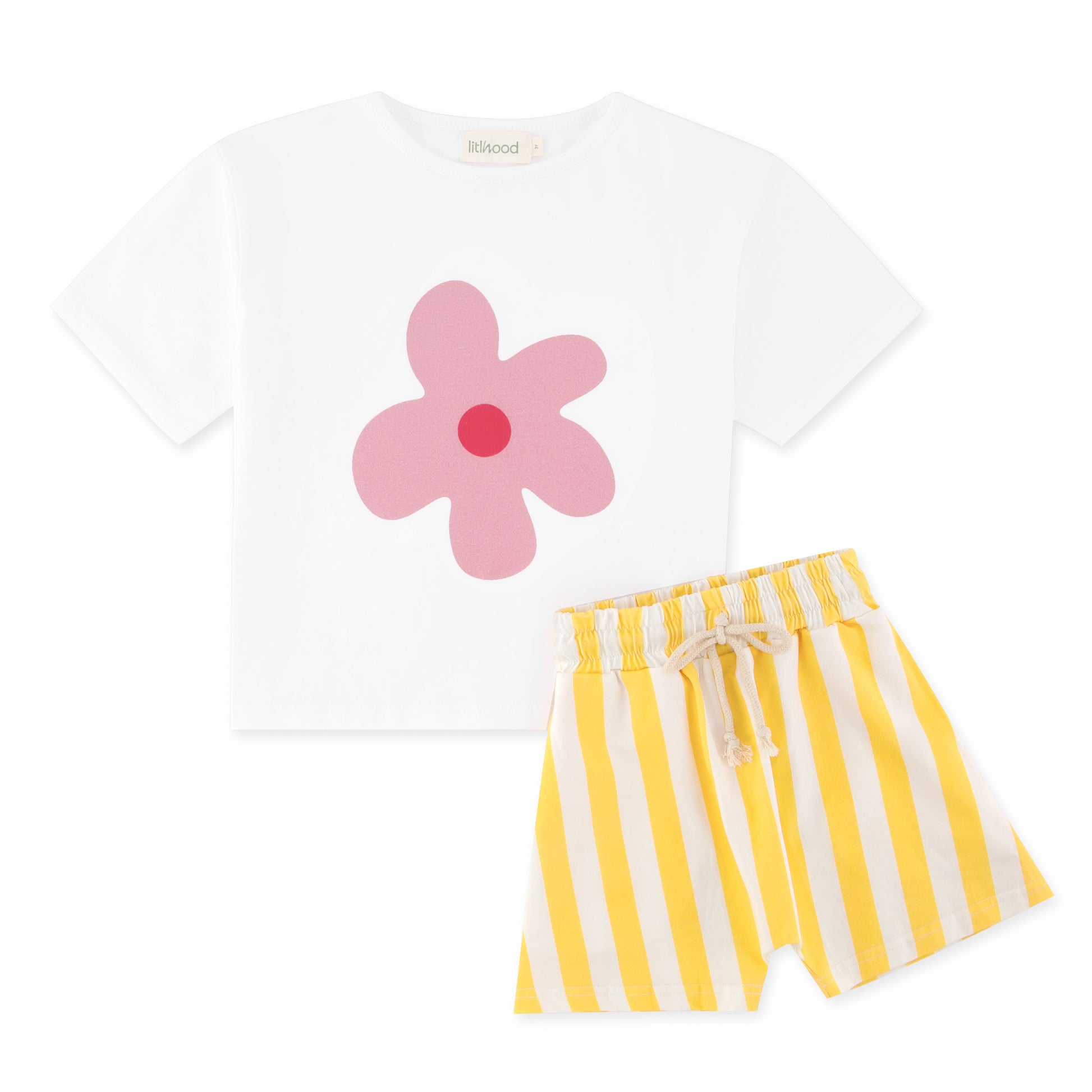 Brighten up their day with this sunny 2-piece set, featuring a soft white cotton t-shirt with a cheerful pink flower print and cozy yellow and white knit cotton shorts. Designed for kids aged 2 to 5 years, this outfit is perfect for warm-weather play, park days, or beachside adventures.