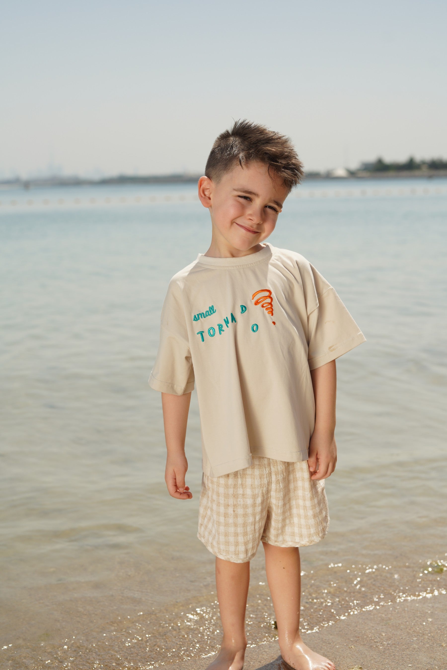 A laid-back look for the littlest trendsetters — this 2-piece set combines a soft beige cotton t-shirt with green embroidery and matching linen shorts in a playful squared print. Designed for boys aged 6 months to 2 years, it’s a cool and breathable outfit made for sunny days and stylish strolls.